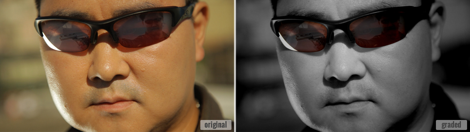 I then looked at the color palette of each scene and took advantage of any outstanding feature to push the colors and contrast in that direction, taking care not to bias the blacks or hilites. In the final scene I faded all colors to B&W except for the main character's sunglasses to hilite the action being replayed on them, and to emphasize the film-noir feeling of the Short.